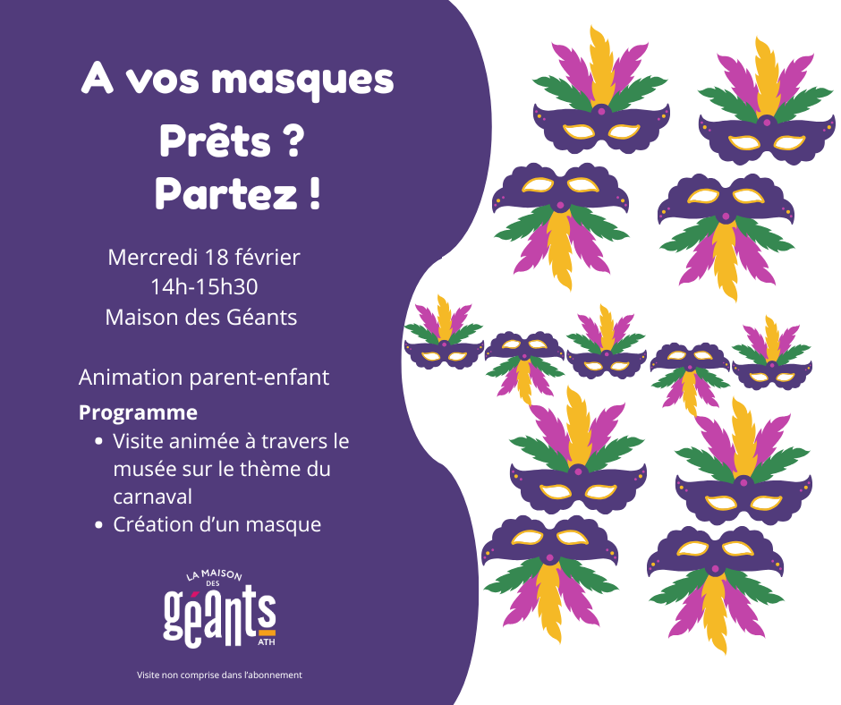 Ensemble, parent & enfant frapperont aux portes des personnages qui raconteront leurs histoires extraordinaires du Carnaval. Il sera question de taille, de costume, de rythme. Cerise sur la gâteau, repars avec ton propre masque pour t’inventer d’autres histoires. L’animation est spécialement pensée pour les enfants de 3 à 9 ans